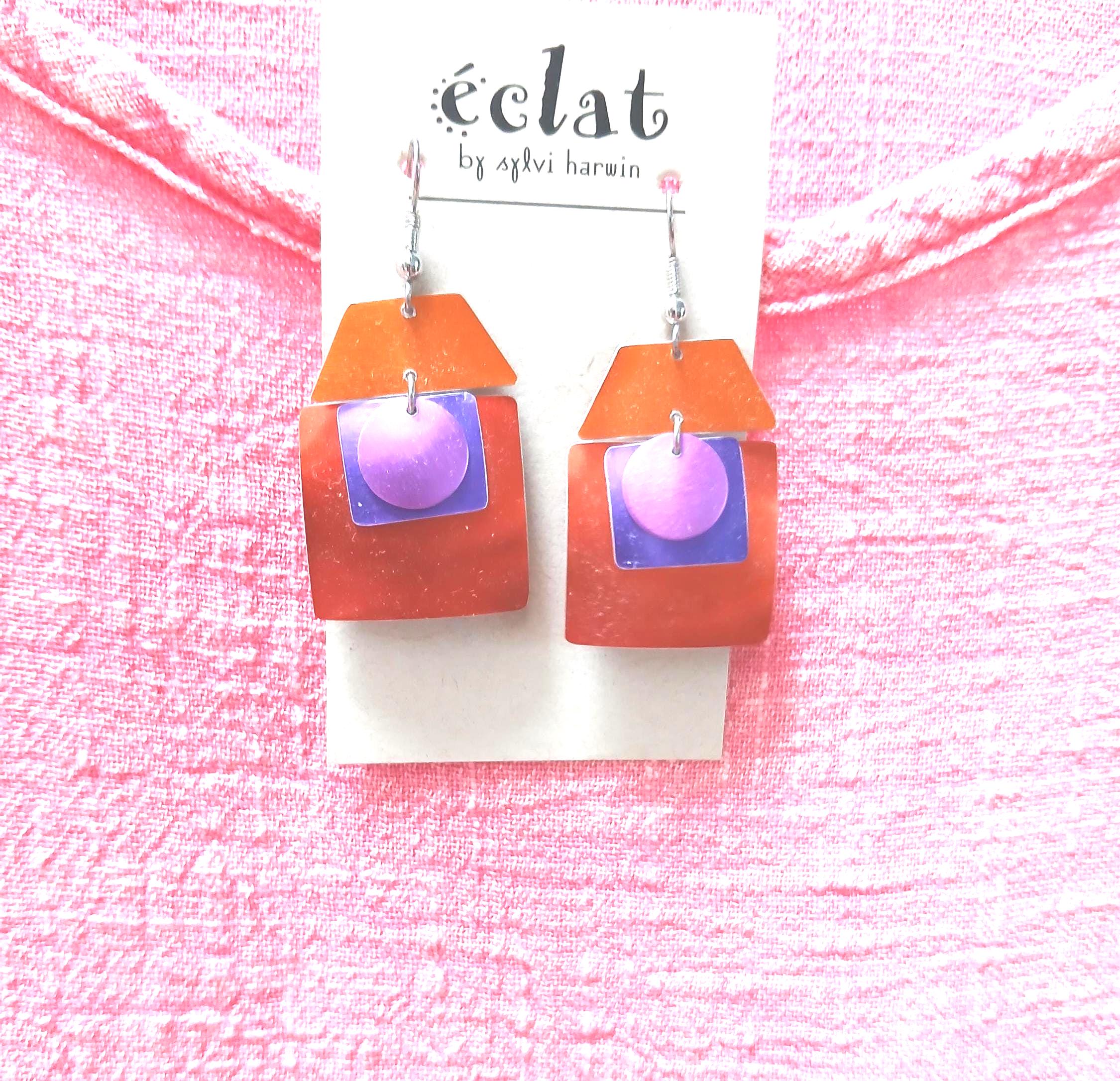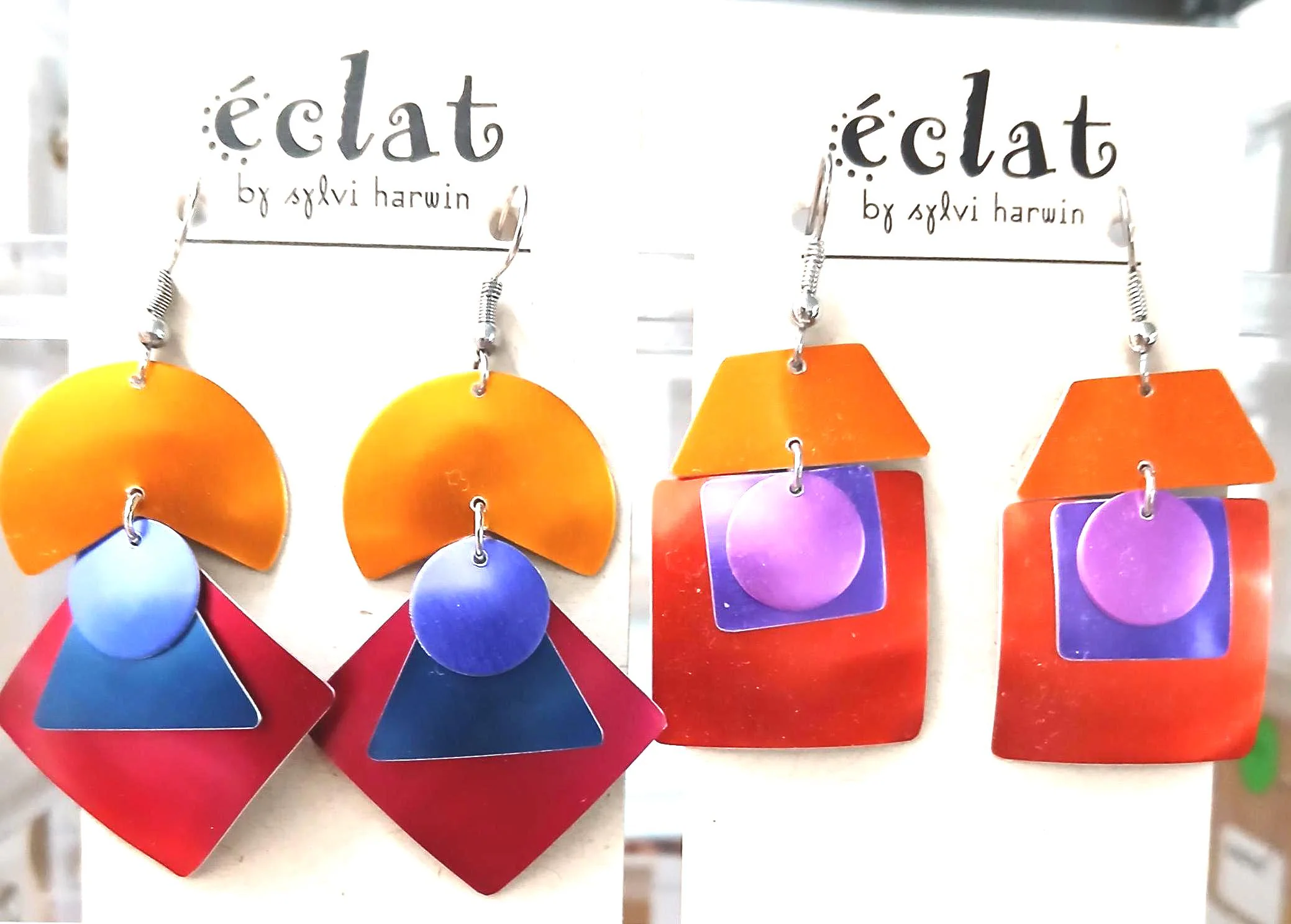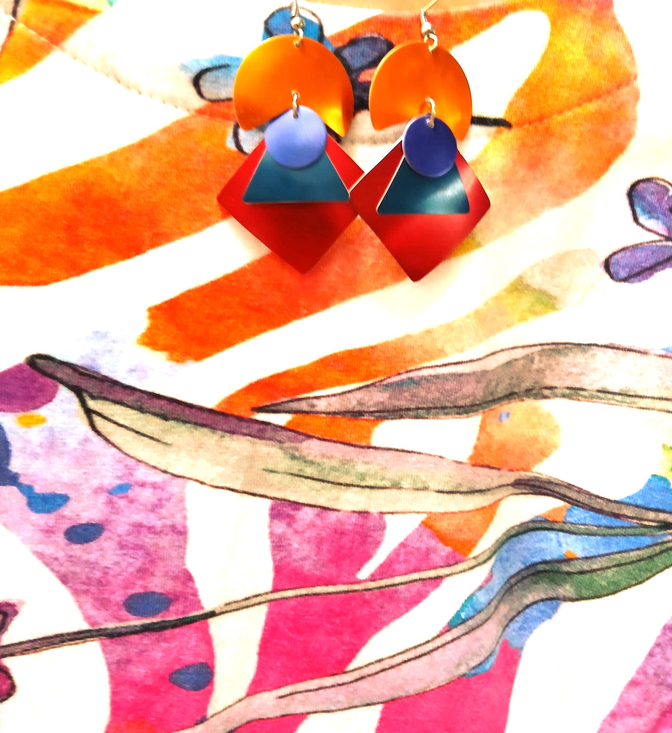 2 styles in hot colors dangle earrings by Eclat aluminum hand-crafted in California light and pefect for matching Your best colors.
