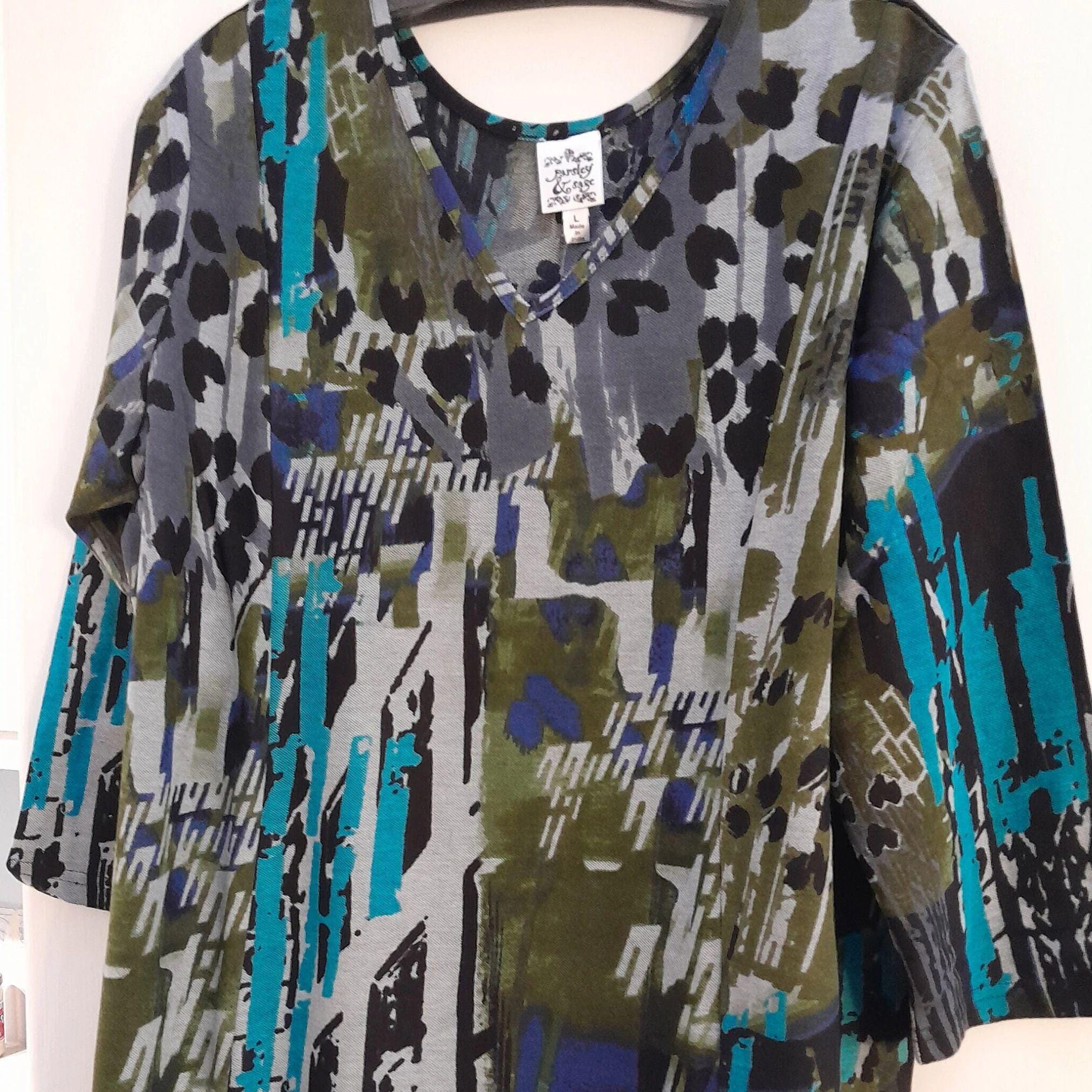 Comfy from now into spring. Front slits detail. Quality Garment with unusual color print! Flattering slimming back detail. Unusual animal print, a tunic in light woven fabric cotton-rayon blend.