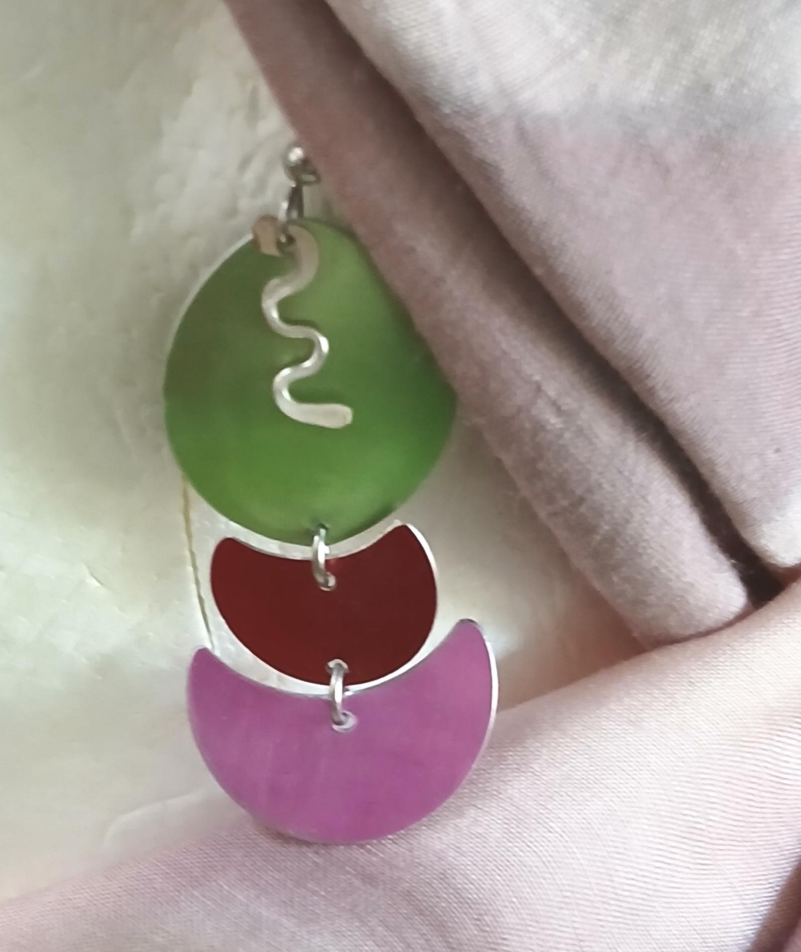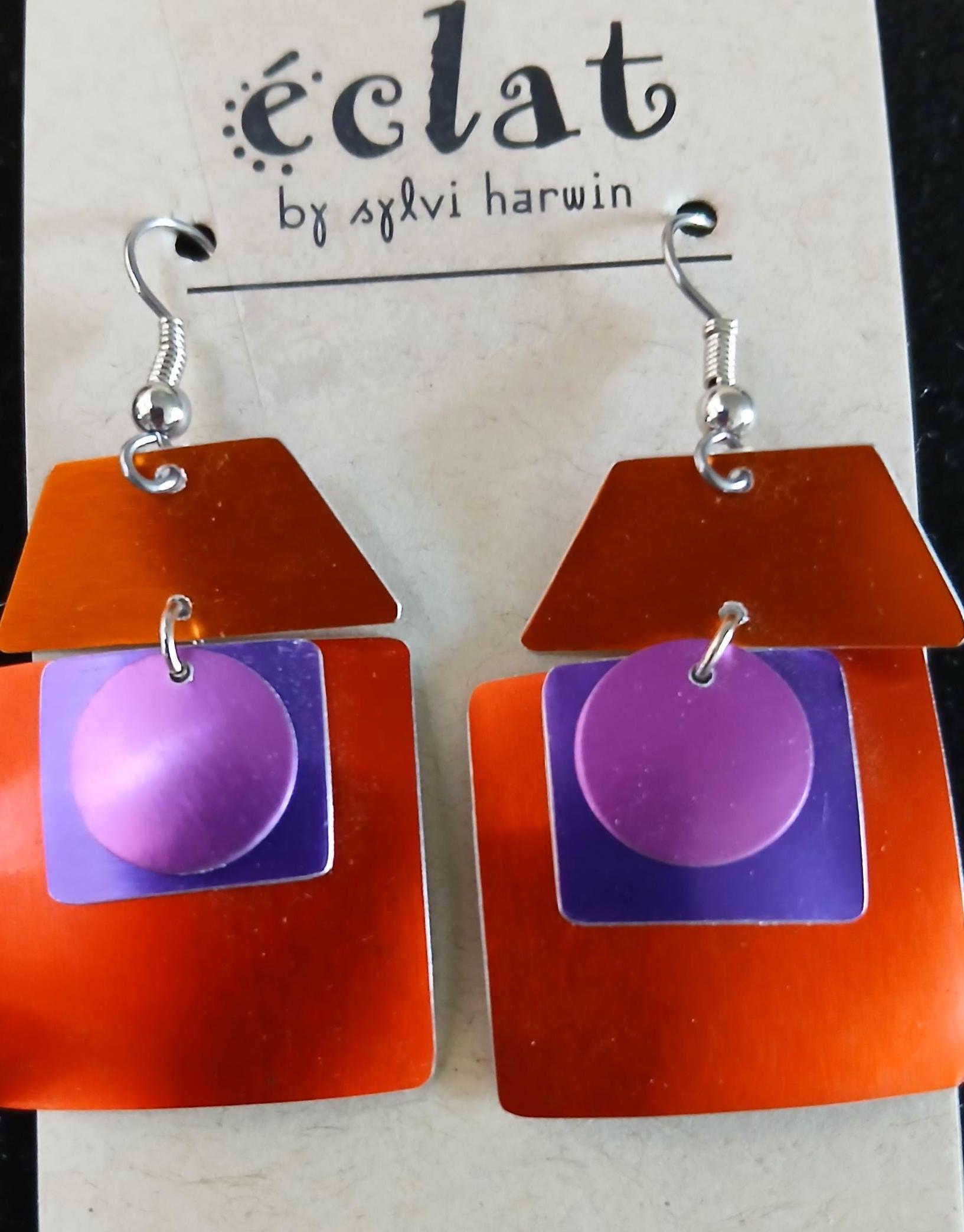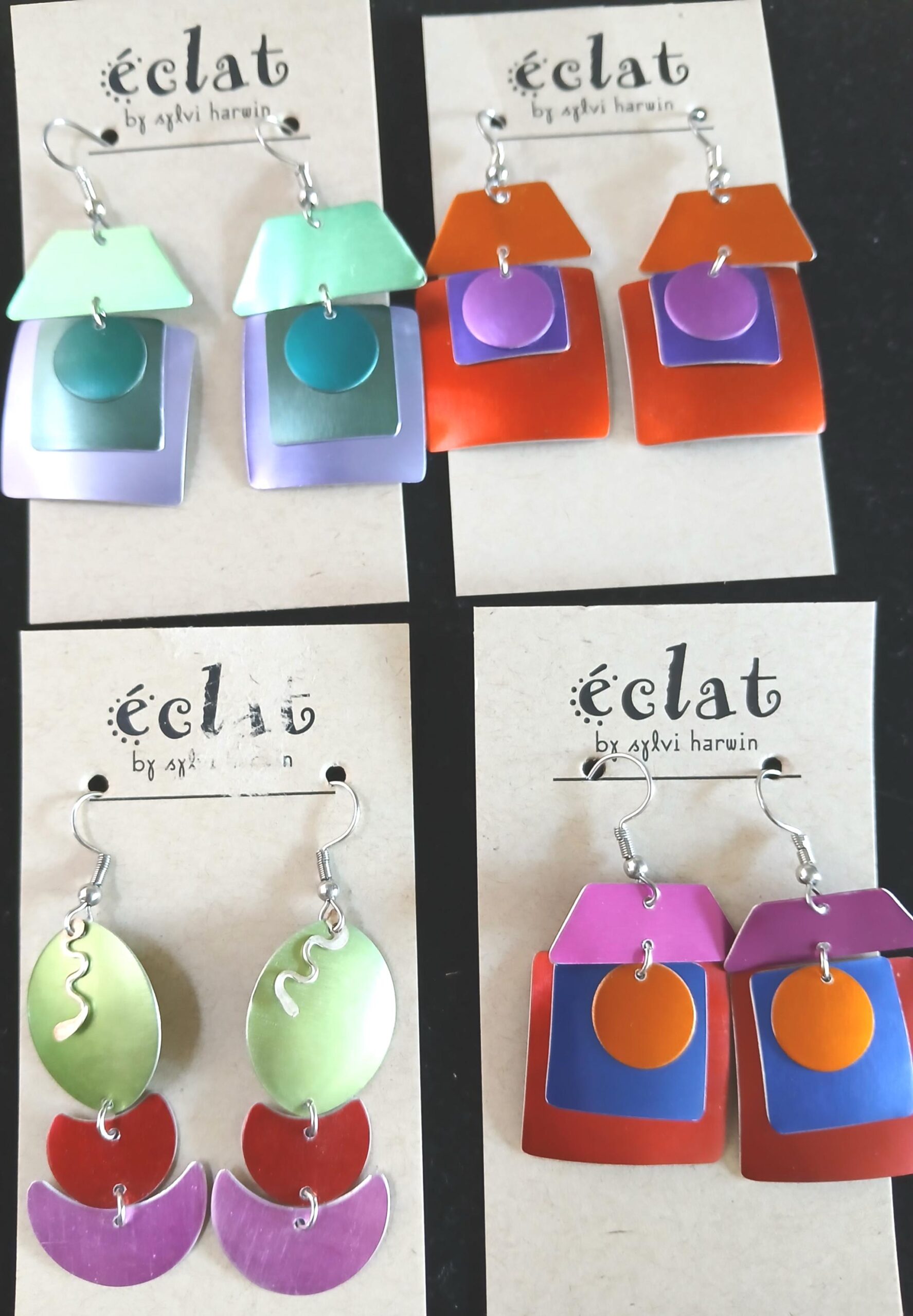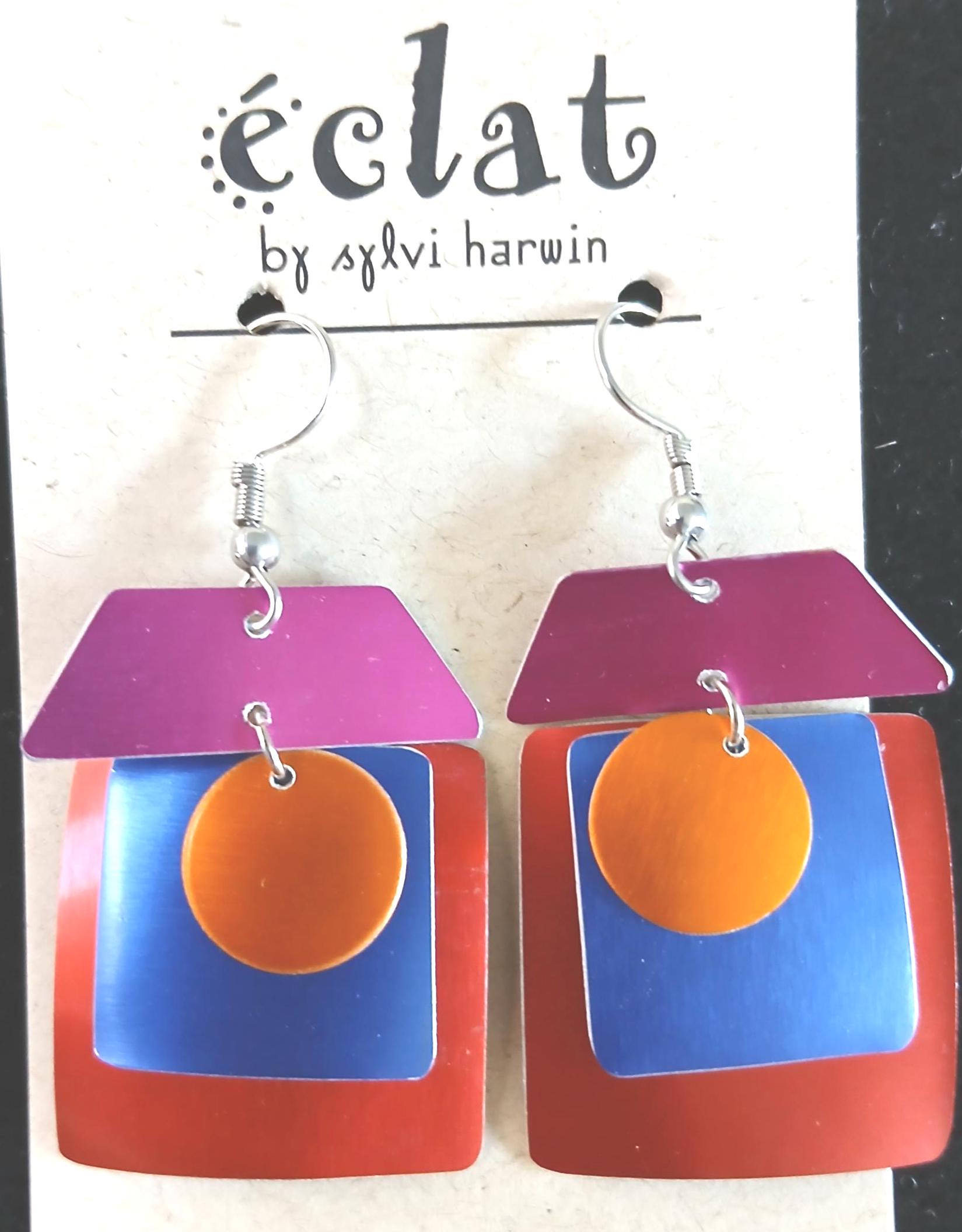 Perfectly crafted on quality aluminum by local artist Sylvi Harwin of Eclat. Artistic shapes brought together in balance. Super light and comfy with quality in mind. Bright happy colors to freshen up your wardrobe that can bring a smile your way. Super light and fun.