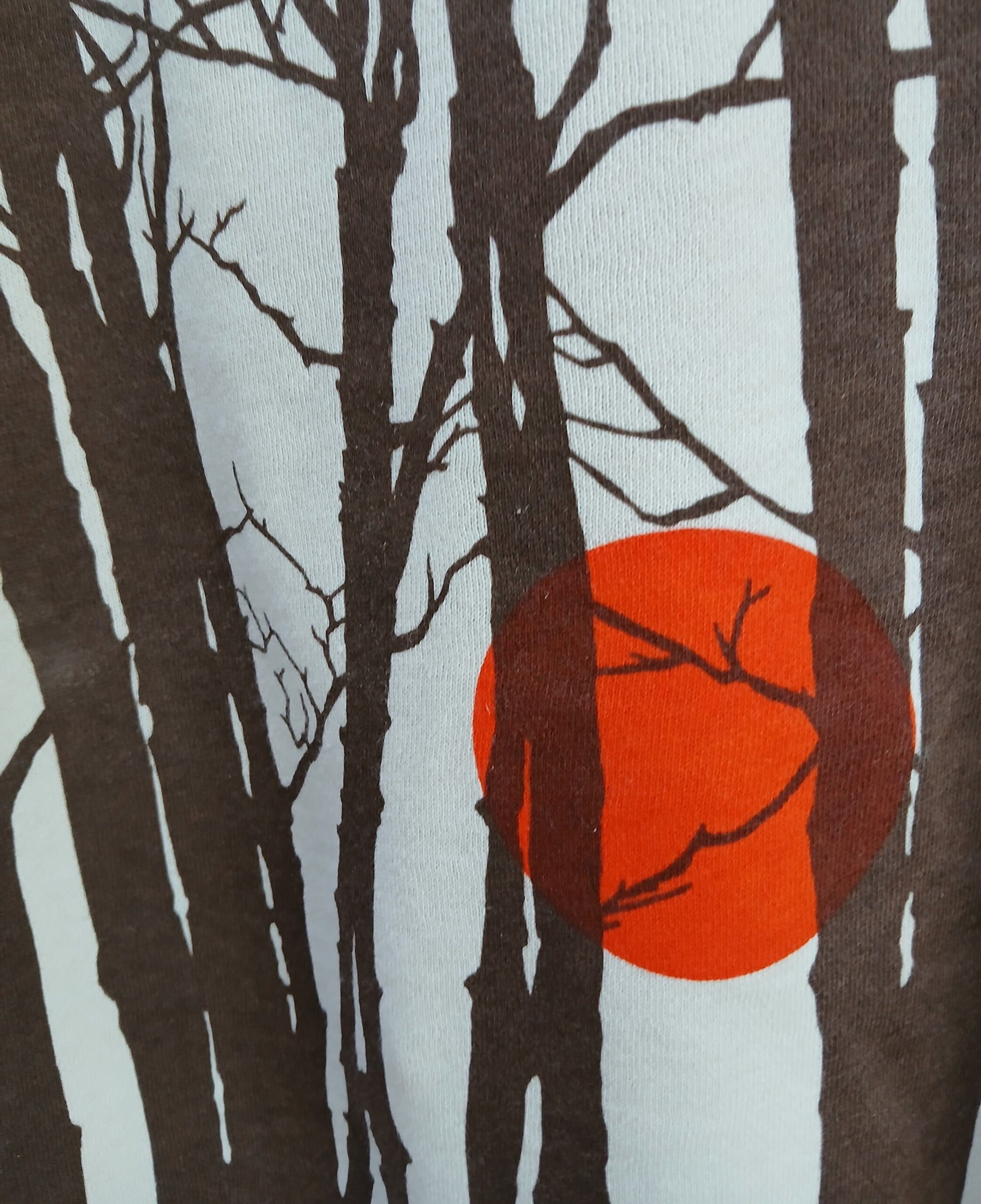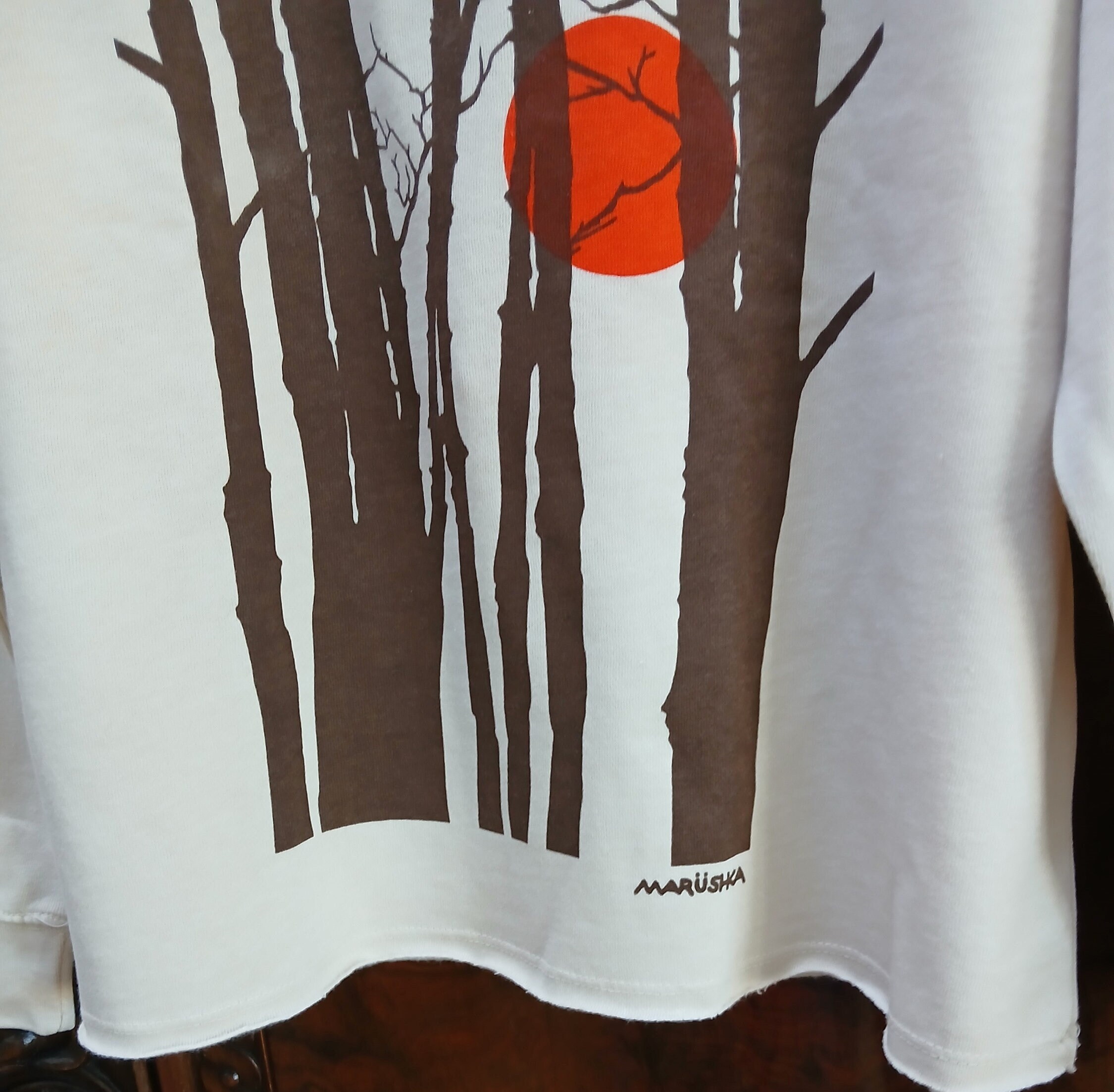 Marushka drop sleeve pullover with raw edge bottom in natural color and trees in fall. Hand silk screened design. The garment has soft light fleece and perfect for cooler days.