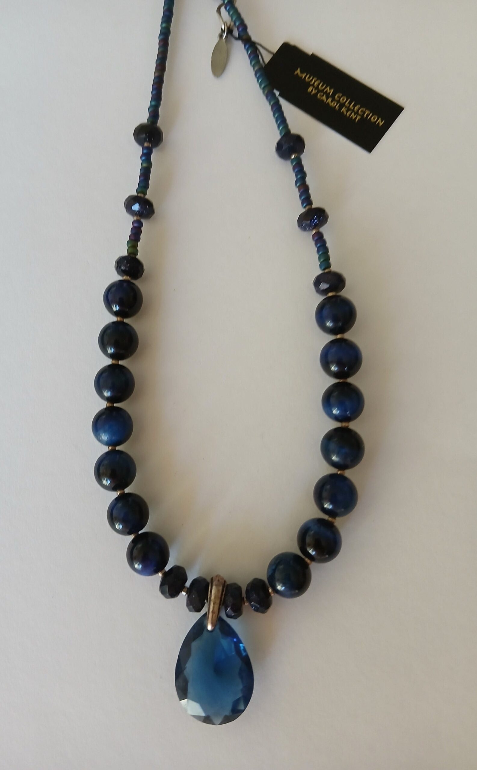 Gorgeous mixed-media necklace made by local artist Carol Kent located in Santa Cruz, California! This necklace is one-of-a-kind and handmade. Made with gorgeous blue tiger's eye and crystal. Can be extended to 8-9" in length. Beautiful, high-quality bead work. Marked from Carol's 'Museum Collection.' Opportunity to buy these beautiful items now at a special, one-time price! we support our local Artists