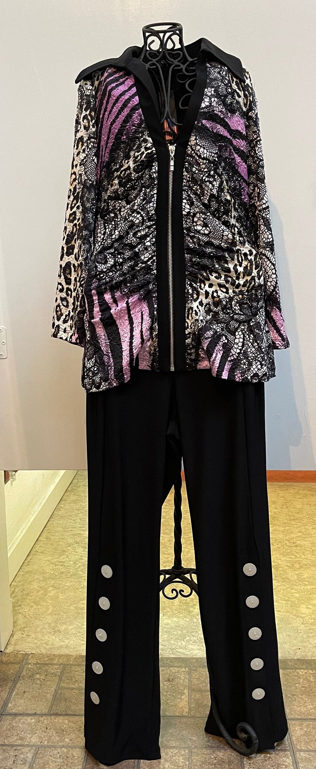 Made by our Italian Designer, Klaveli, these pants are wonderful. They feature button details along the bottom portion. The pants feature small darts near waistline that give a slimming, tailored appearance and fit. They flare out on the bottom. Top is not included in the purchase on pants. Inseam measurements: Either 28" (short) or 30" (long) can be personalized.