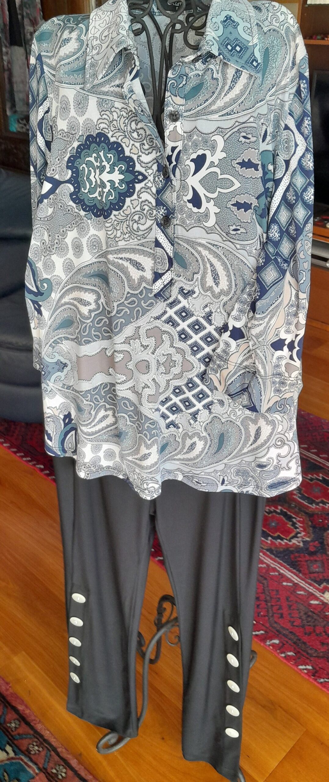 Be the first to review “Classic ladies blouse half button paisley fleur design | steel blue artisan fashion by Klaveli” Cancel reply