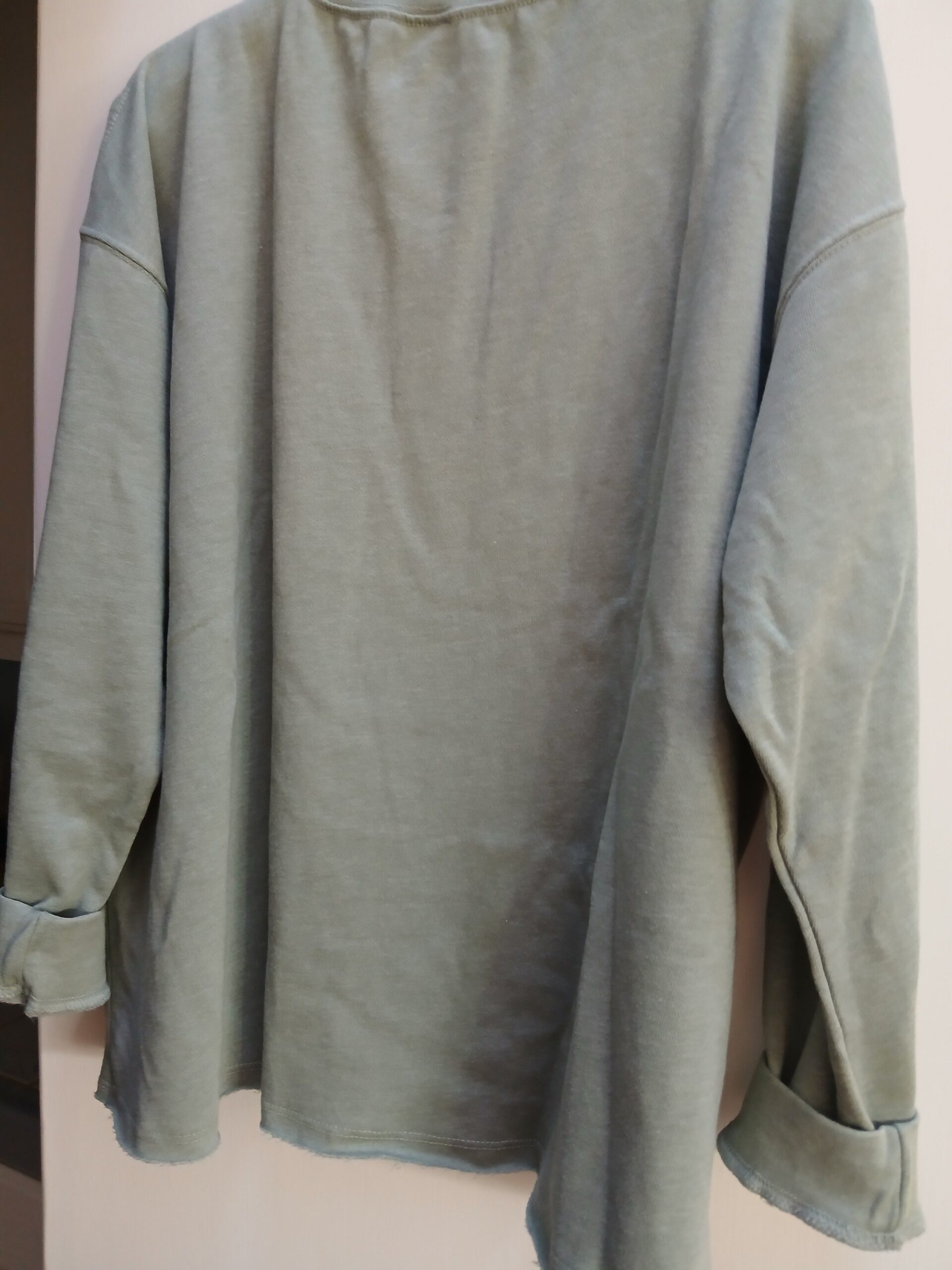 Cotton poly pill resistant light soft fleece sweatshirt. Raw edge hemline with double needle stitch. relaxed boxy fit. We can order sizes SM to XXL. Perfect comfort for cooler days. Need a different size? We can special order – fitted just for You.
