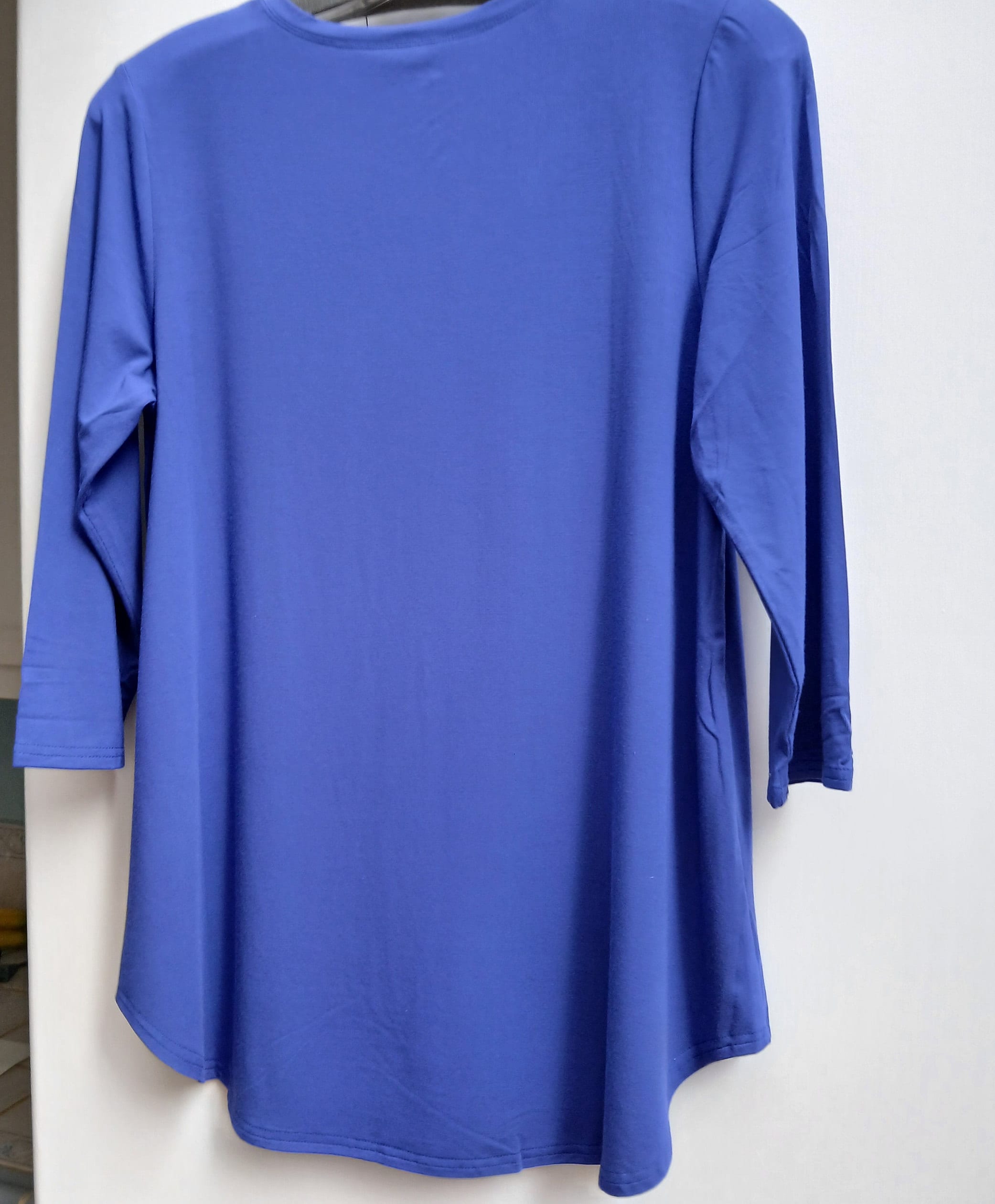 Elegant jazz tunic violet | bamboo stretch 3/4 sleeve top flattering plus size layer XS–3X by Blue Sky