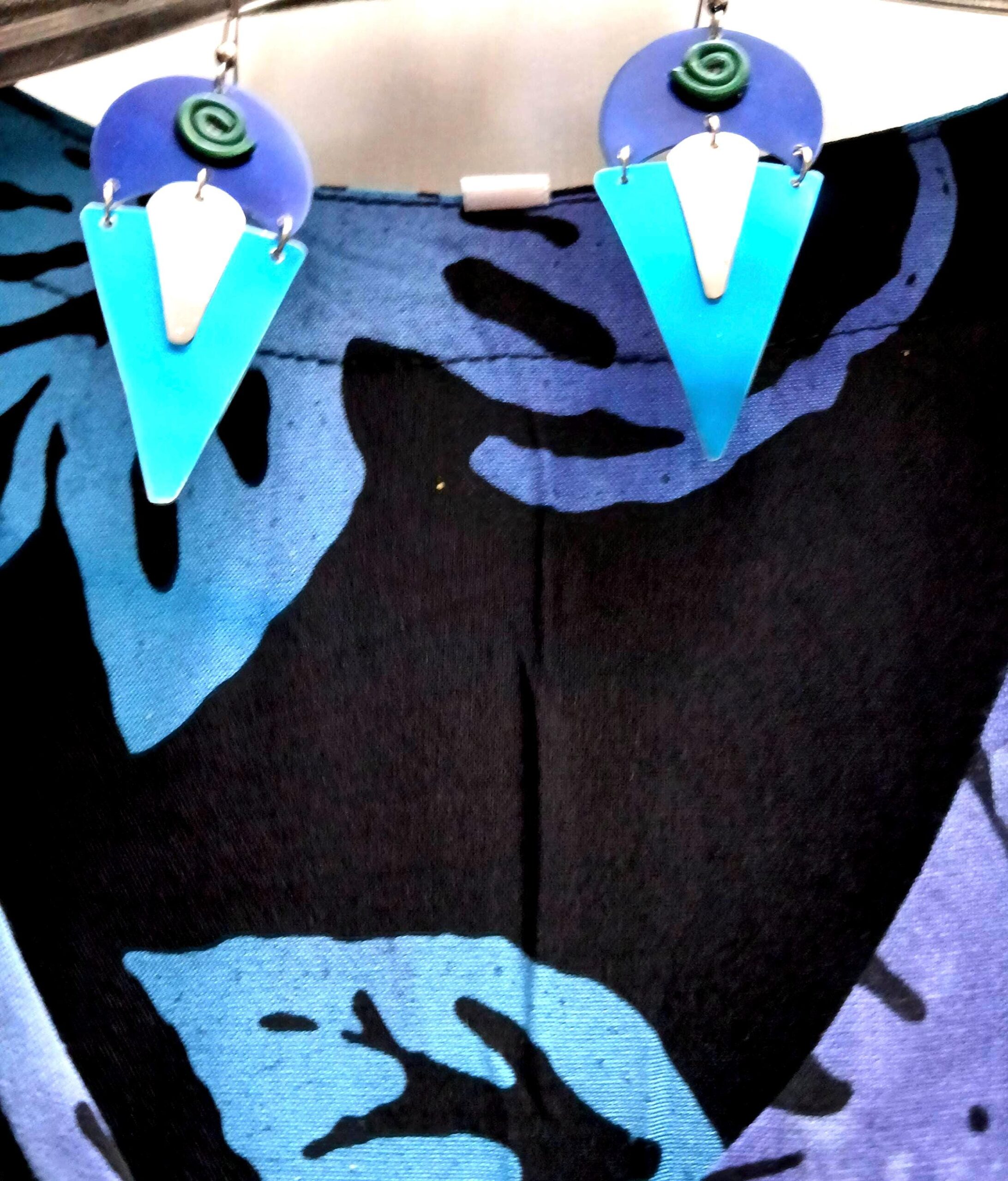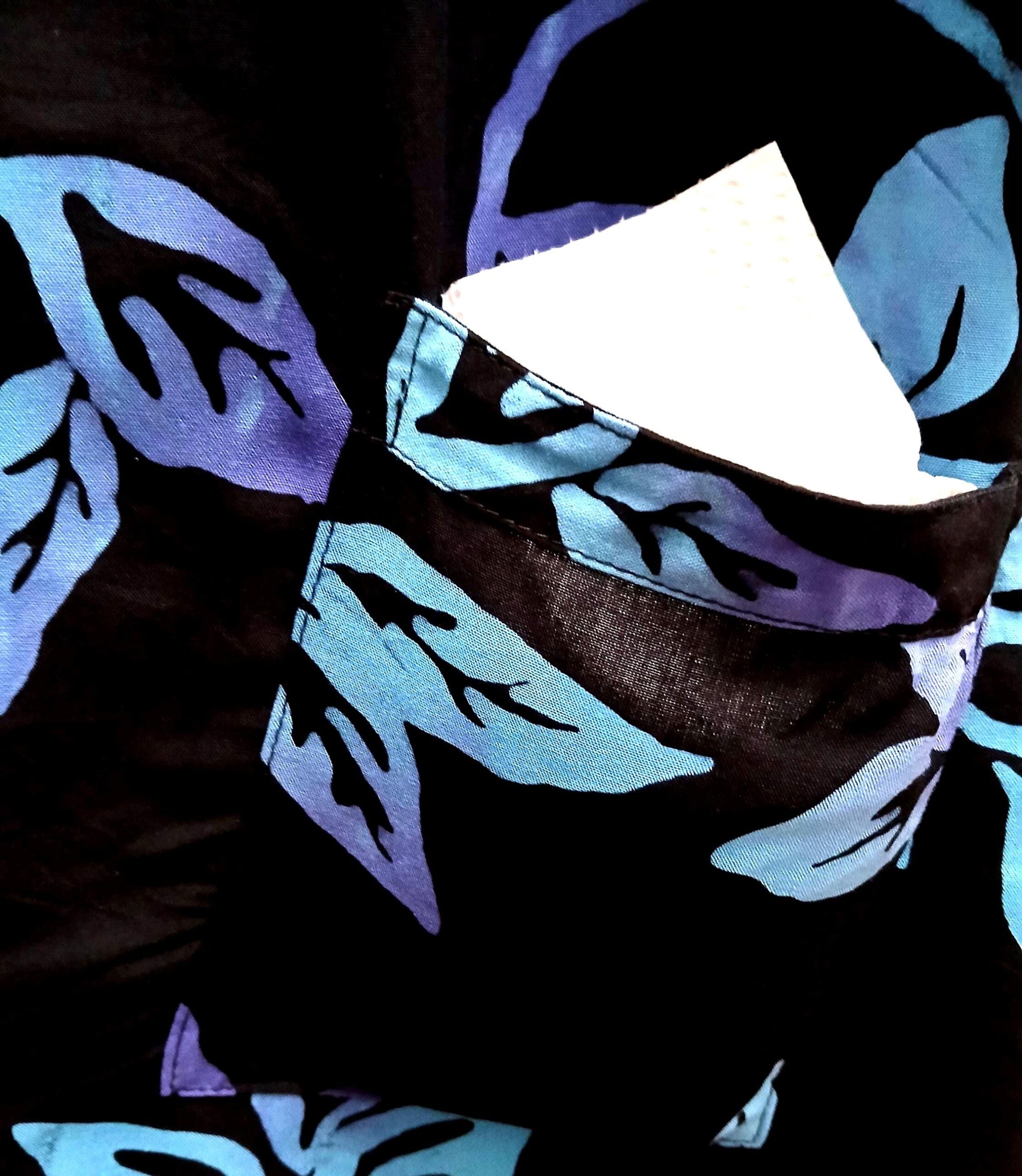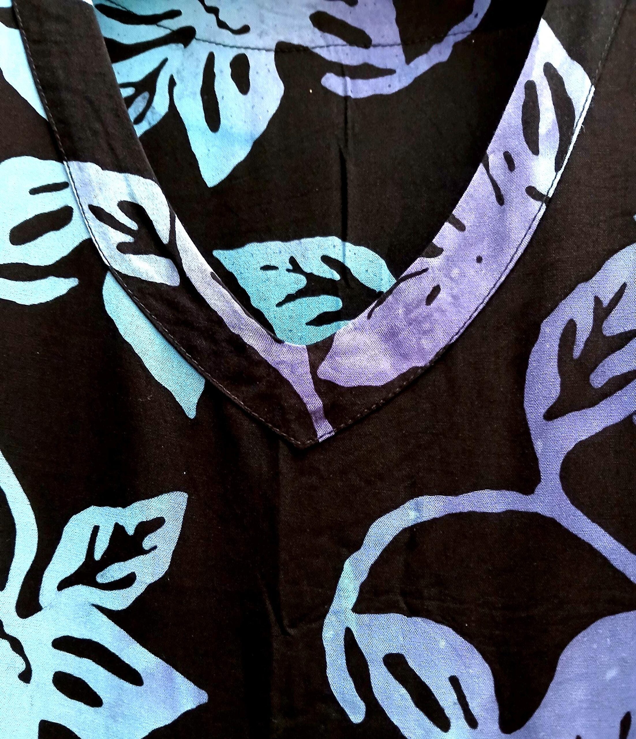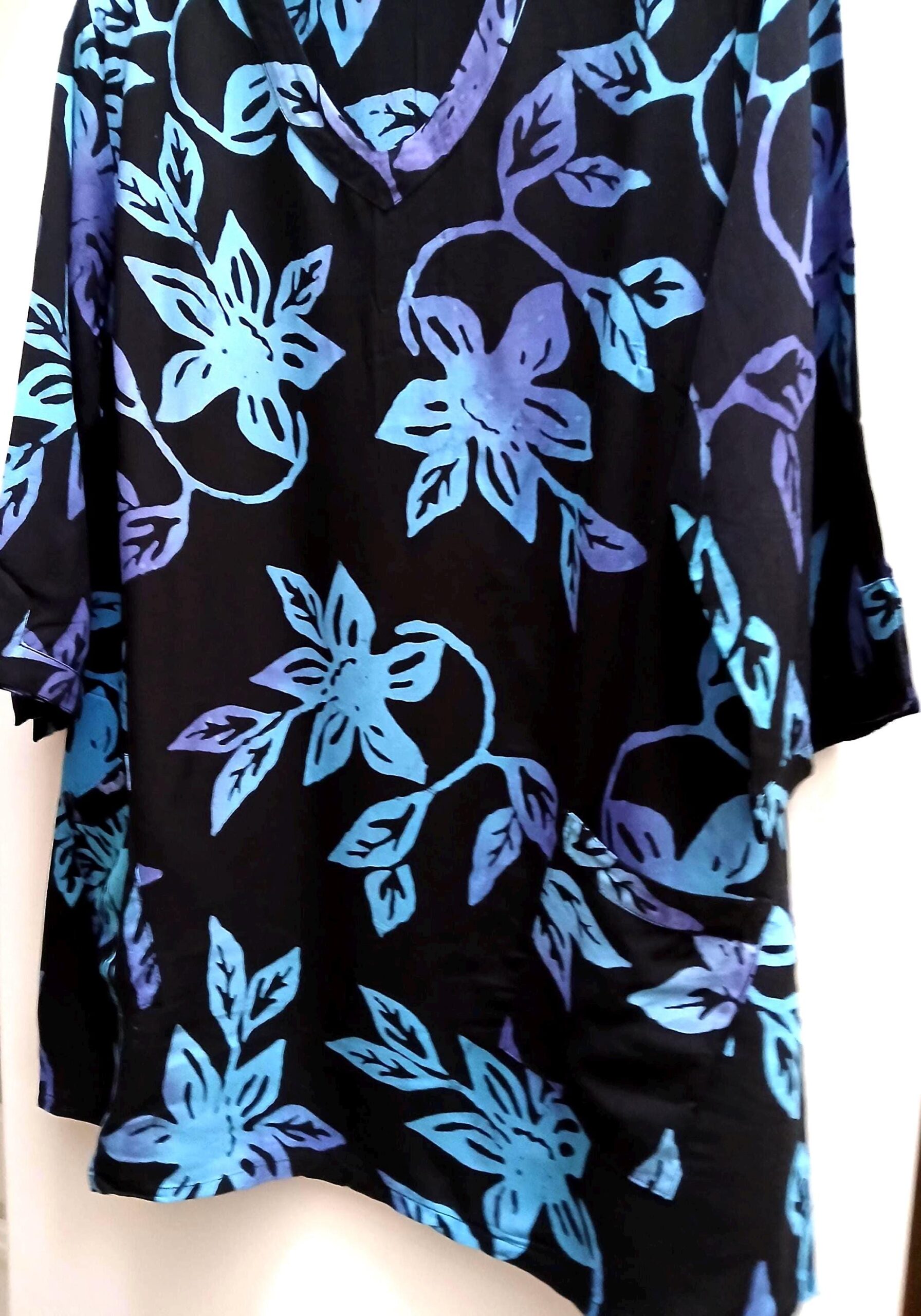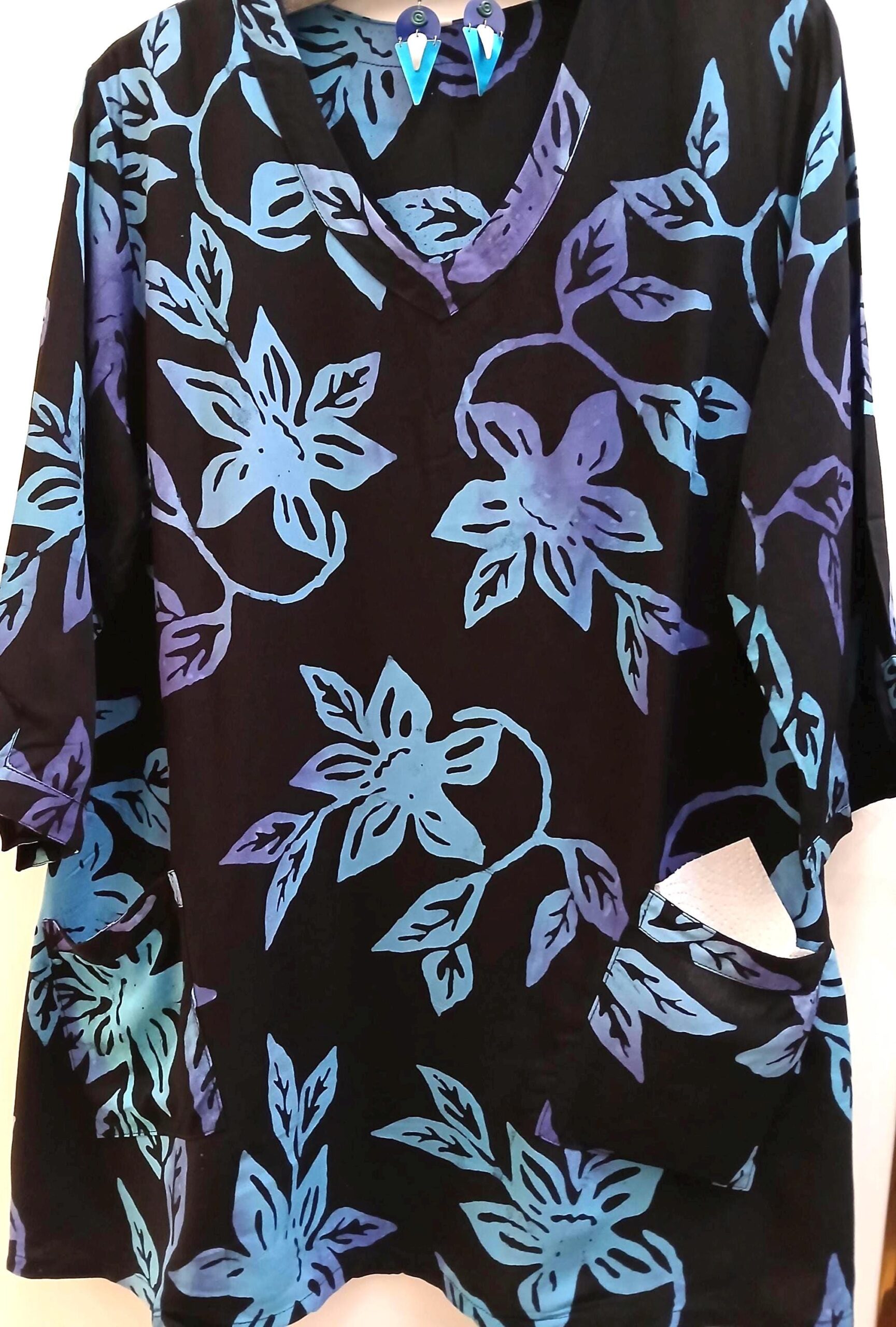 Fairytale Tunic in hand batik black-blue rich floral print on plant based rayon. V-neck and 2 pockets. Nature lovers’ treat.