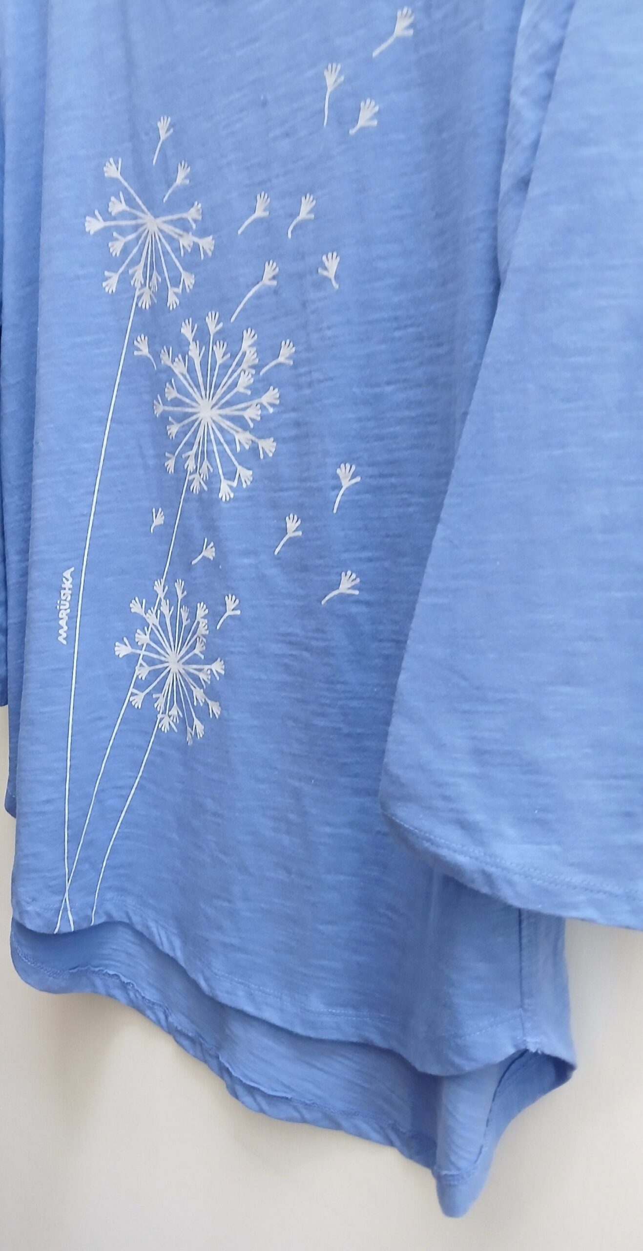 Discover the artistry of Marushka with this stunning periwinkle blue dandelion t-shirt. Each piece is hand silk-screened in the USA, celebrating eco-conscious fashion and timeless design.