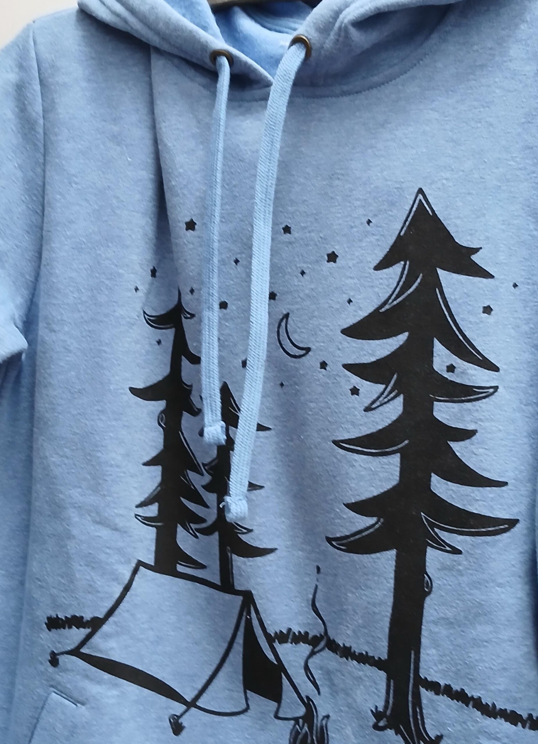 Handprinted fleece hoodie limited edition campsite print | blue heather,black print. This is a warm winter fleece but soft and light.