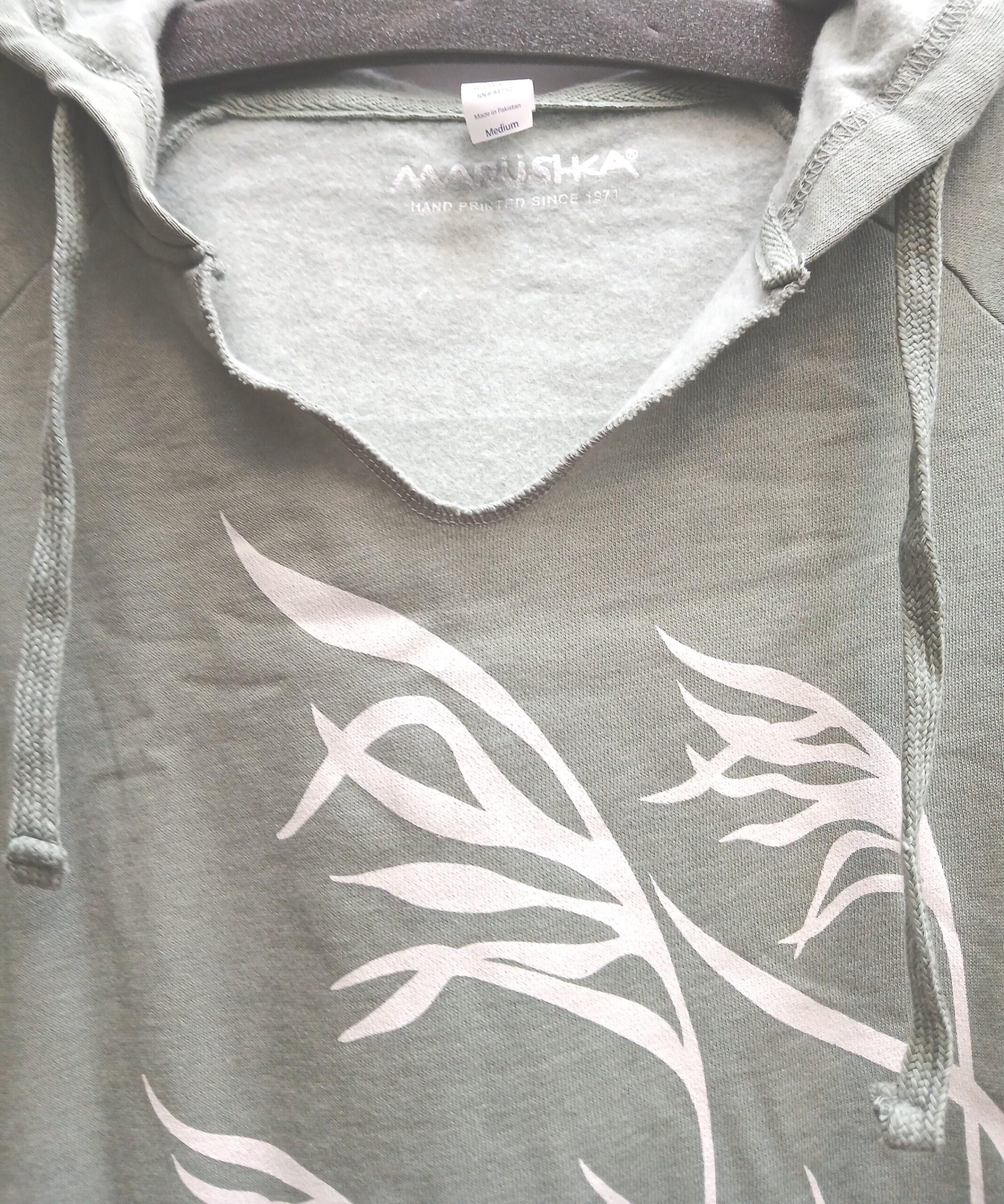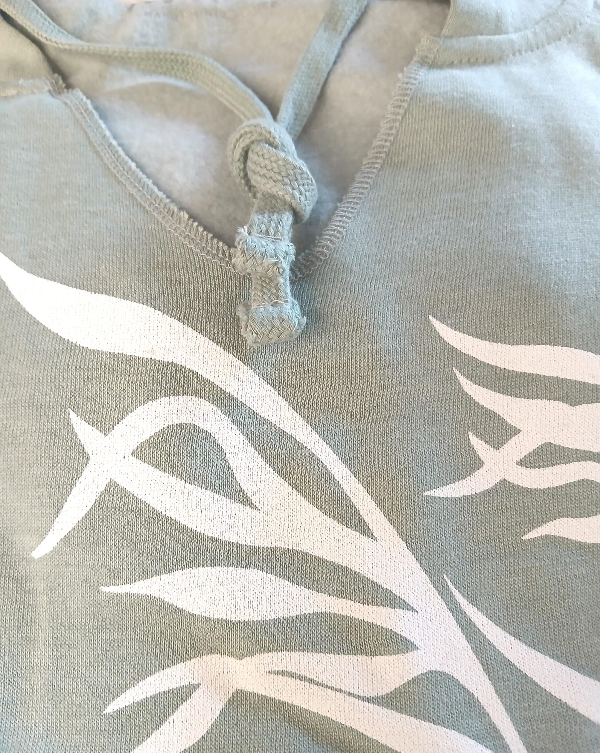 Marushka. Longer length body style. Hand screened light fleece hoodie. Sage with seagrass design.