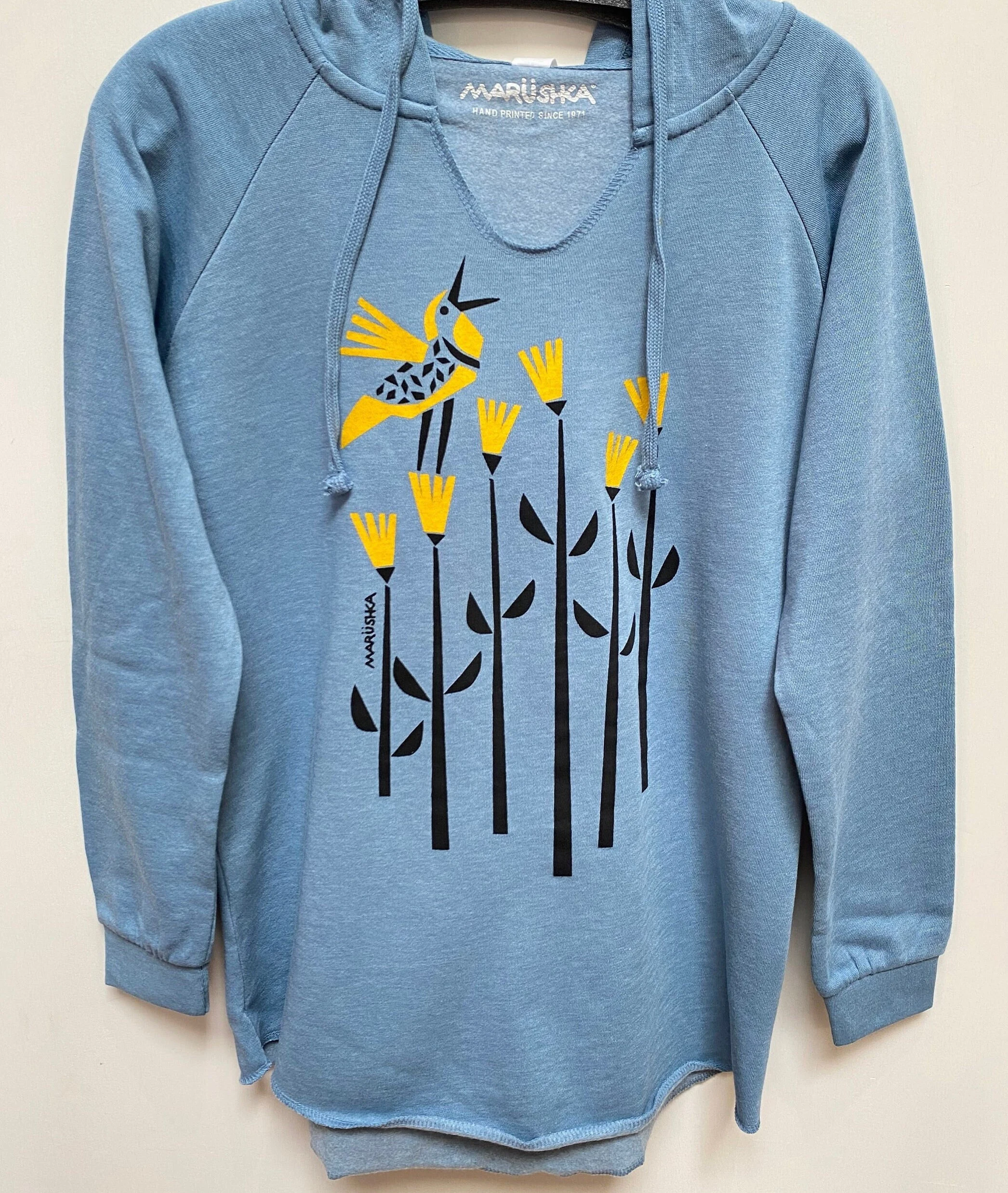 Lightweight cotton-blend fleece with a relaxed, easy fit. Smooth outside, soft inside, and hand-printed with Marushka’s Meadow Lark design.