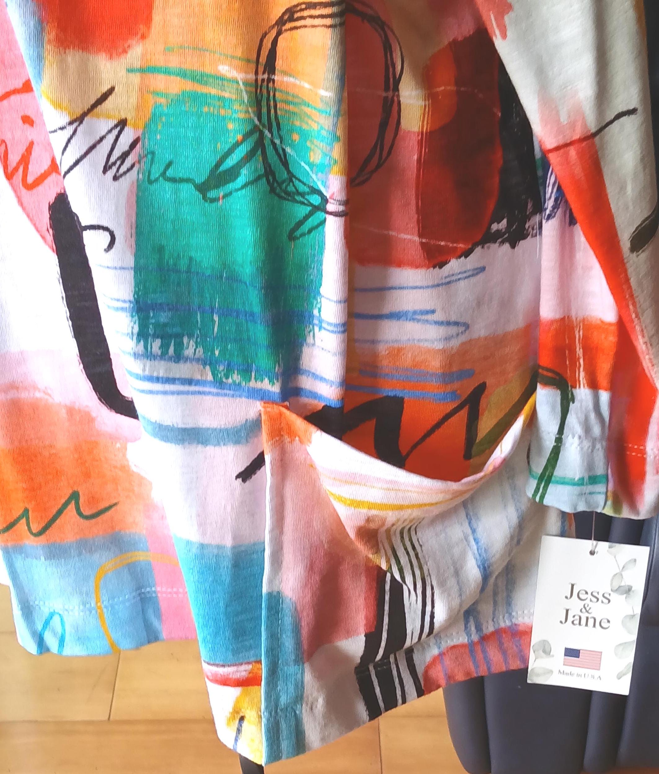 Versatile and eye catching, this boutique essential pairs beautifully with jeans, skirts, or lightweight pants. A distinctive design by Jess and Jane.