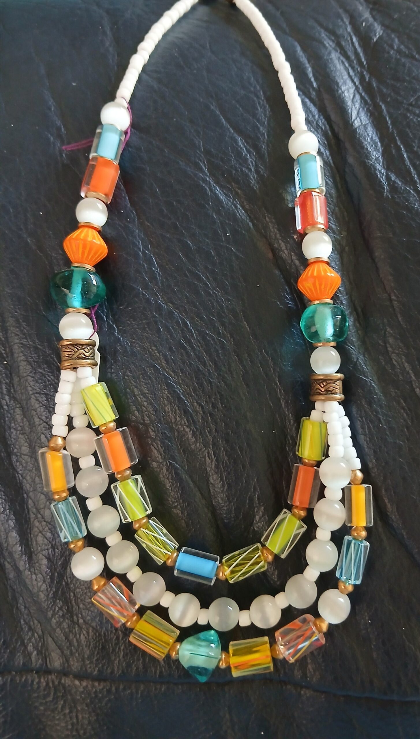 Necklace, brilliant beads summer colors. Adjusts to 18″ Hand made in California. Carol Kent.