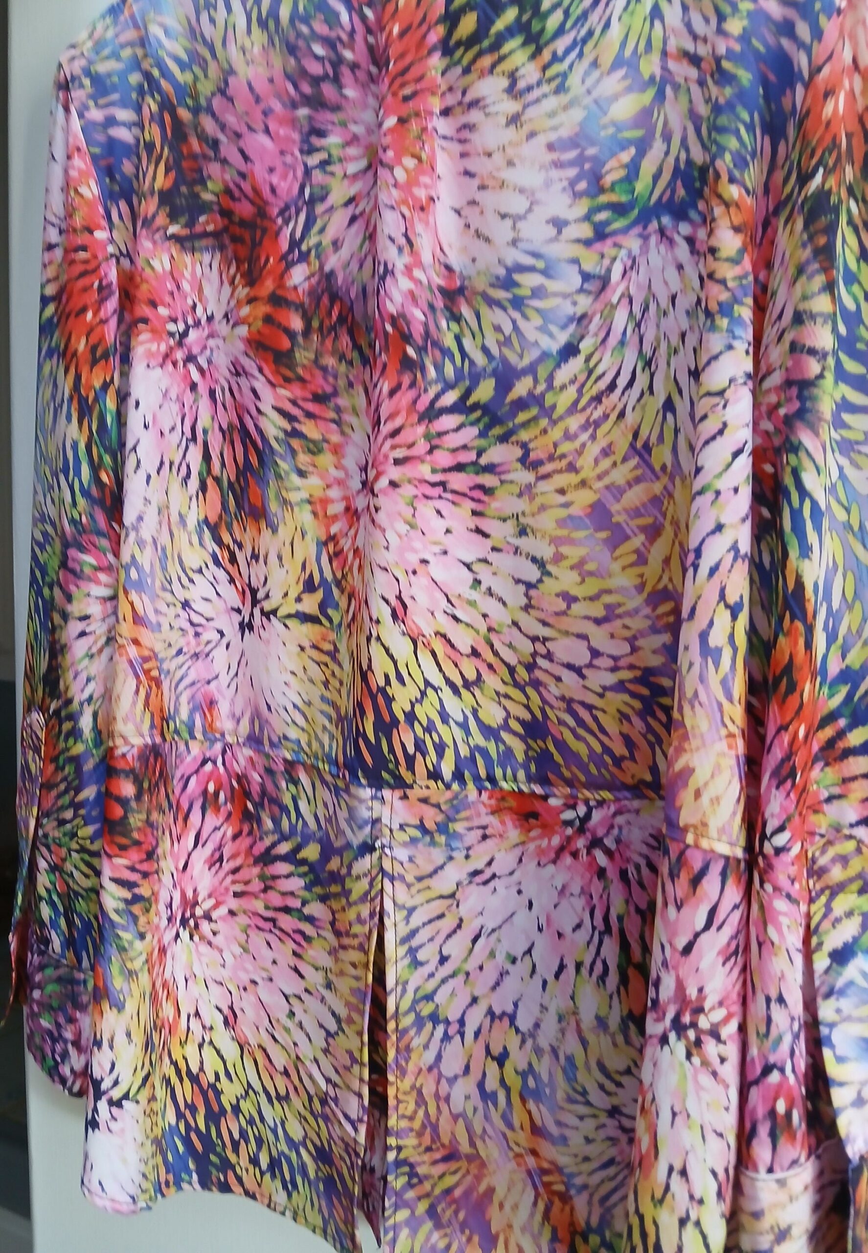 Chiffon fabric imported from Europe and is washable and dries without wrinkles! This is fine workmanship to be worn on any special Occasion or with jeans. Cool open weave but great all year wear. Great price compared to lesser quality at $150 or more. Pleat and slit in back. Can be ordered in 3/4 sleeve sizes are XS to 1X
