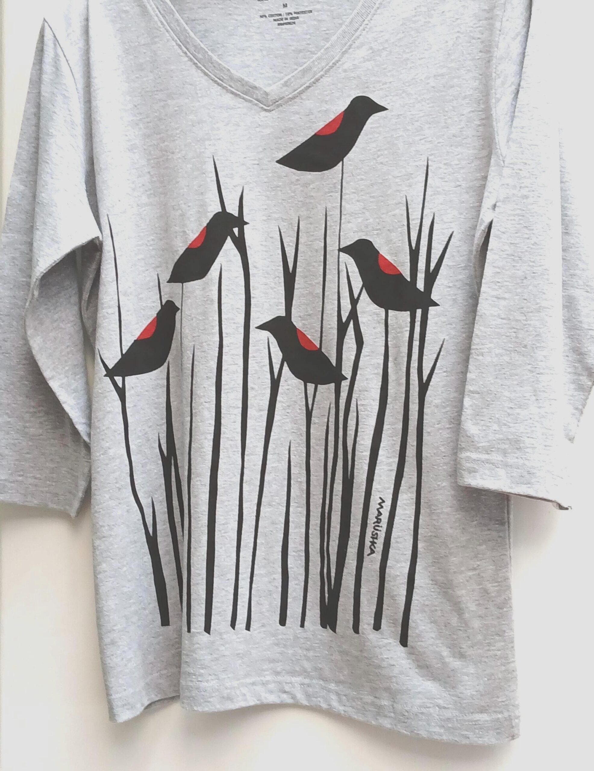 Petite gray v neck tee shirt red winged blackbird | 3/4 sleeve nature tee hand screened