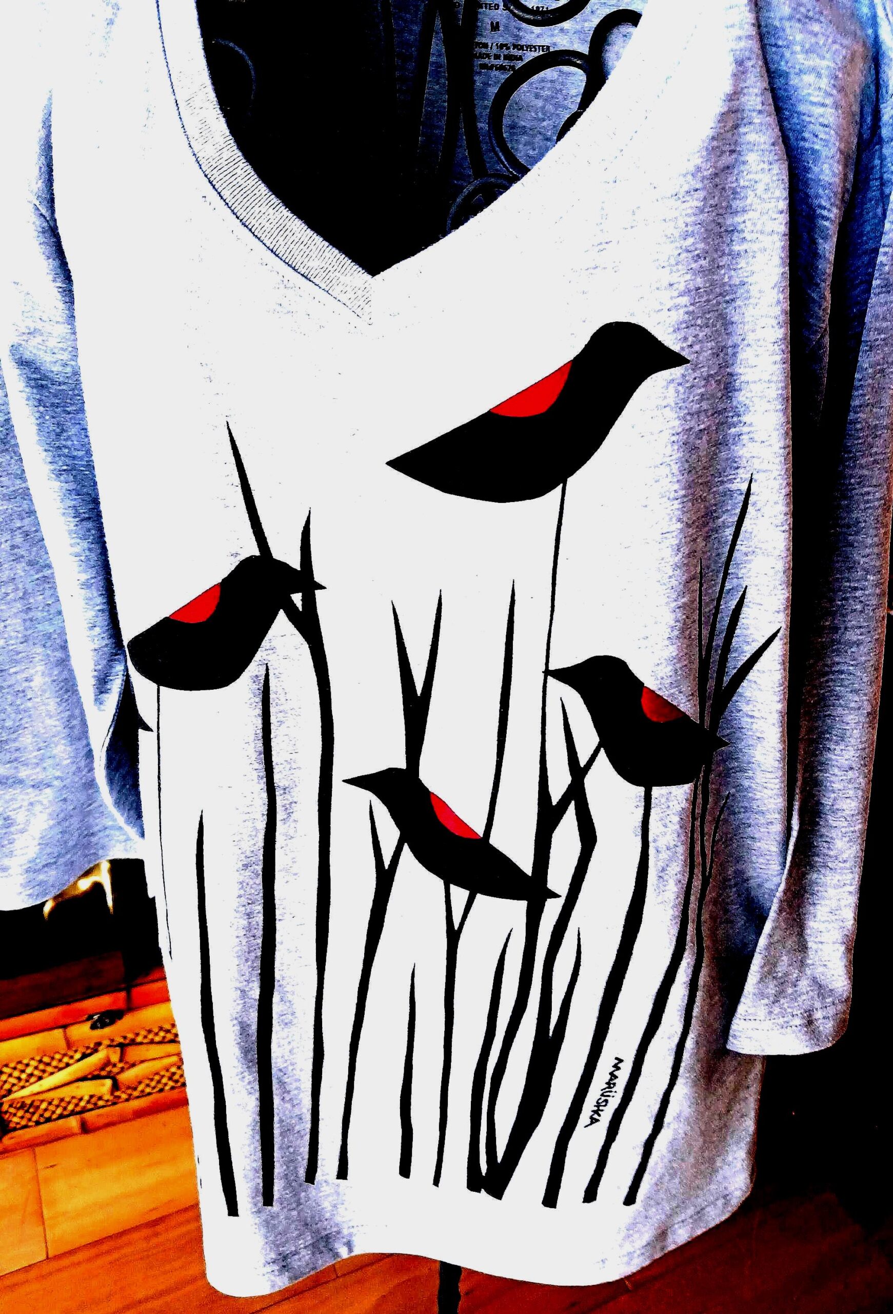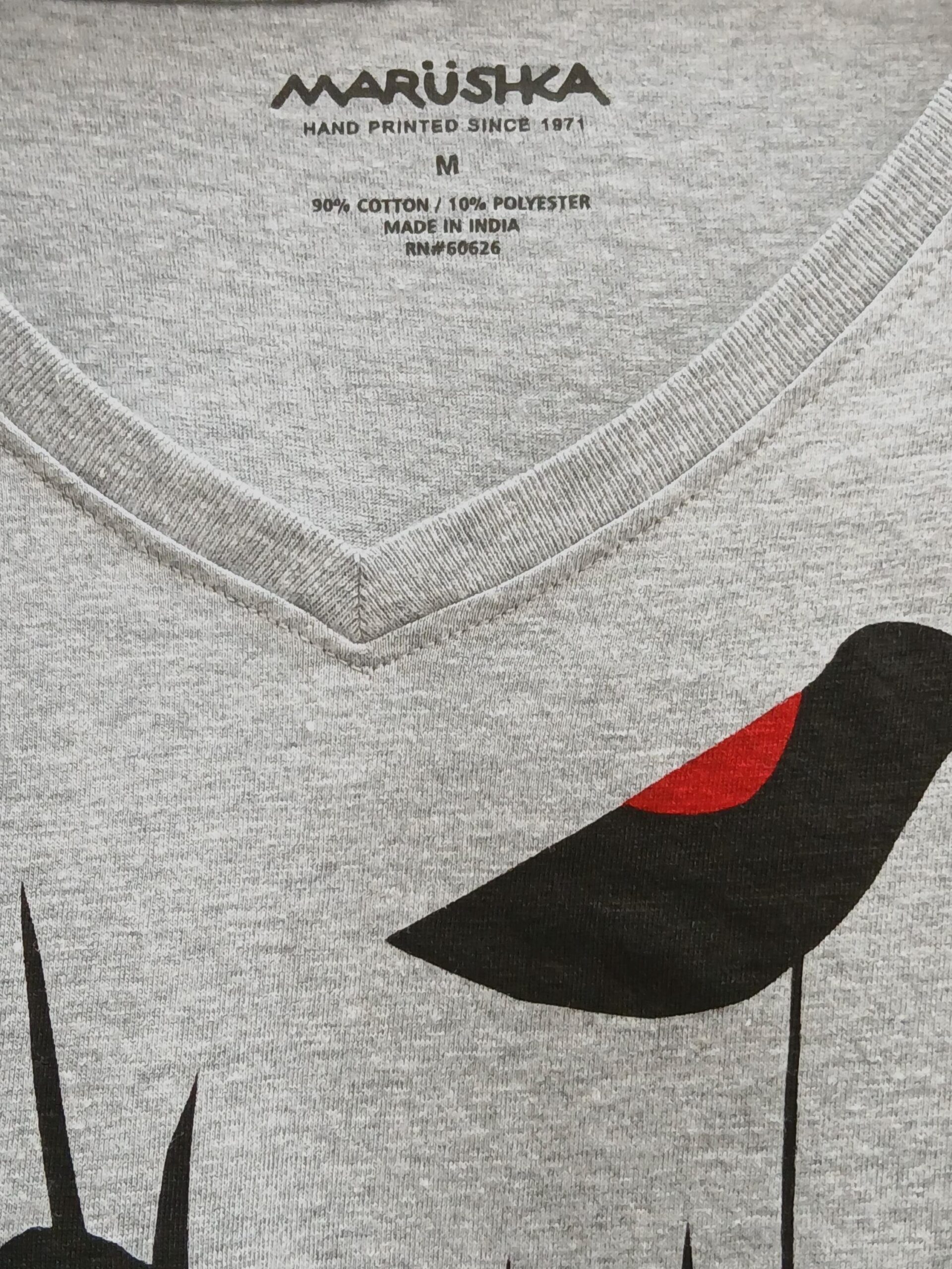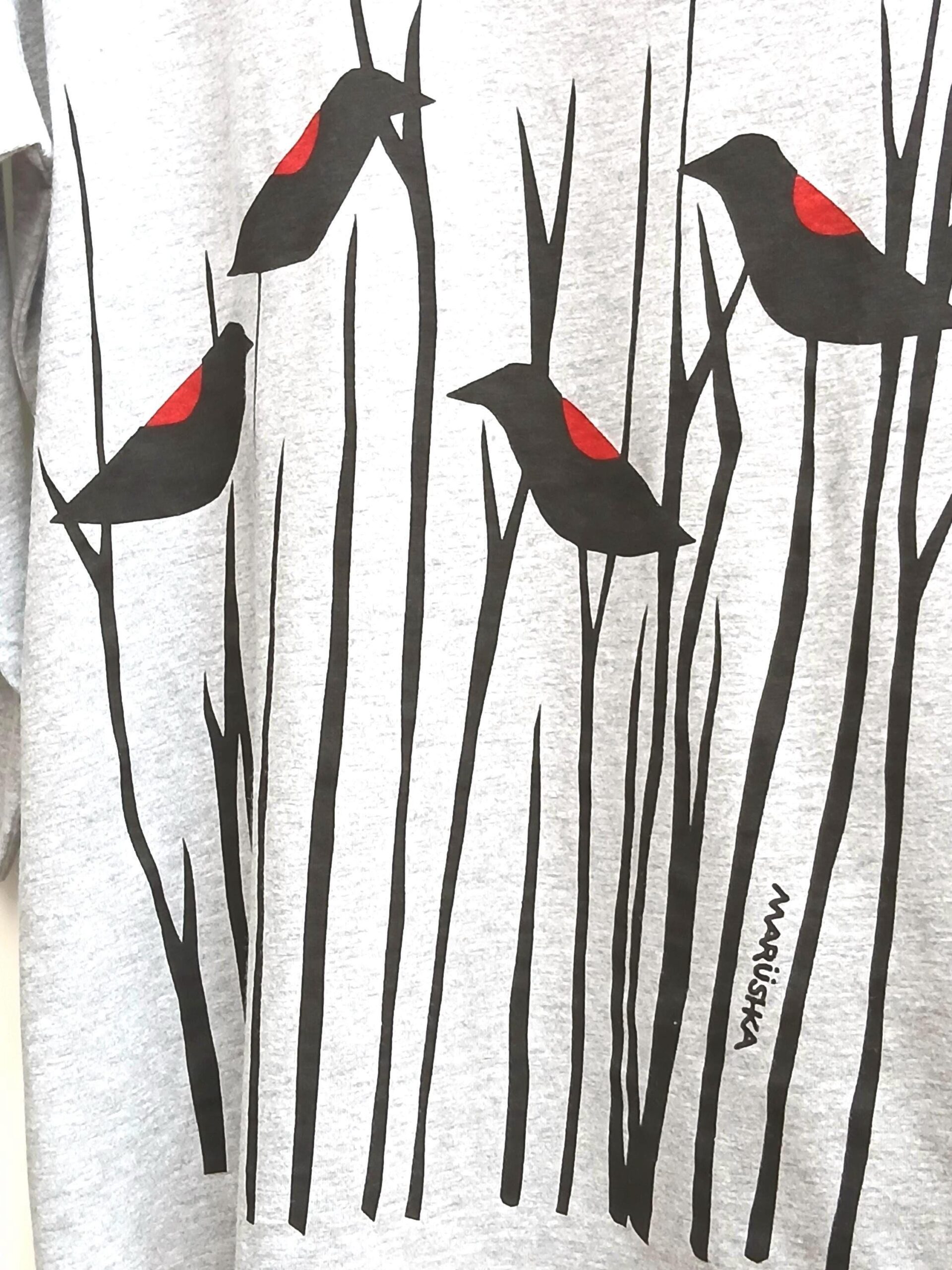 t-shirt featuring a striking red-winged blackbird, hand-screened by Marushka in Michigan.