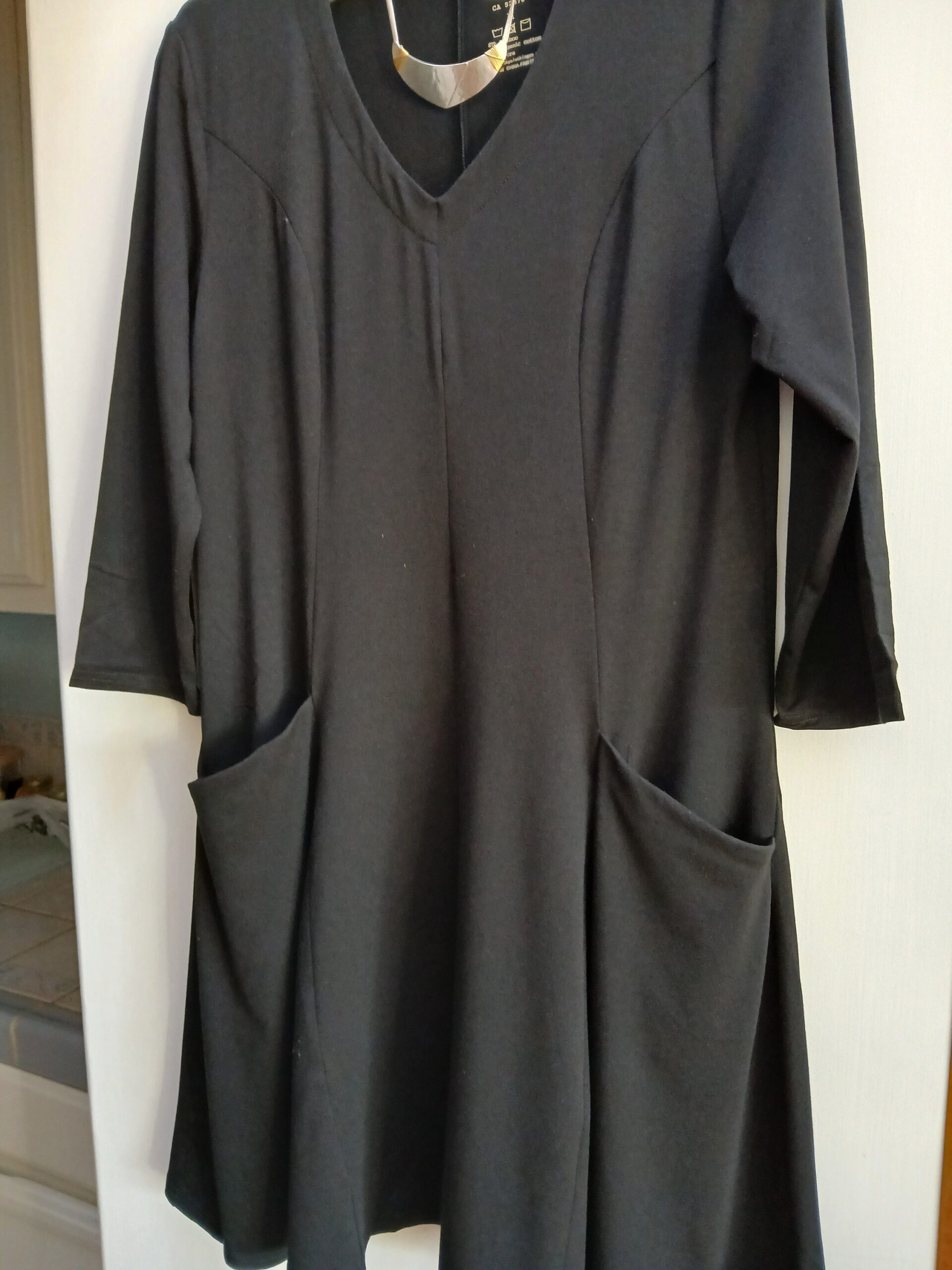 What a beautiful classic style princess seaming follows natural contours of bust, waist and hips. flat pockets incorporated in seams the V-neck is not low. This Wilma tunic belongs in your closet and your body. I am in awe of how beautiful this style is made. XXS to 2X special order in grey, special occasion or every day. Pair with Marjorie Baer Drop Necklace that's different on both sides.