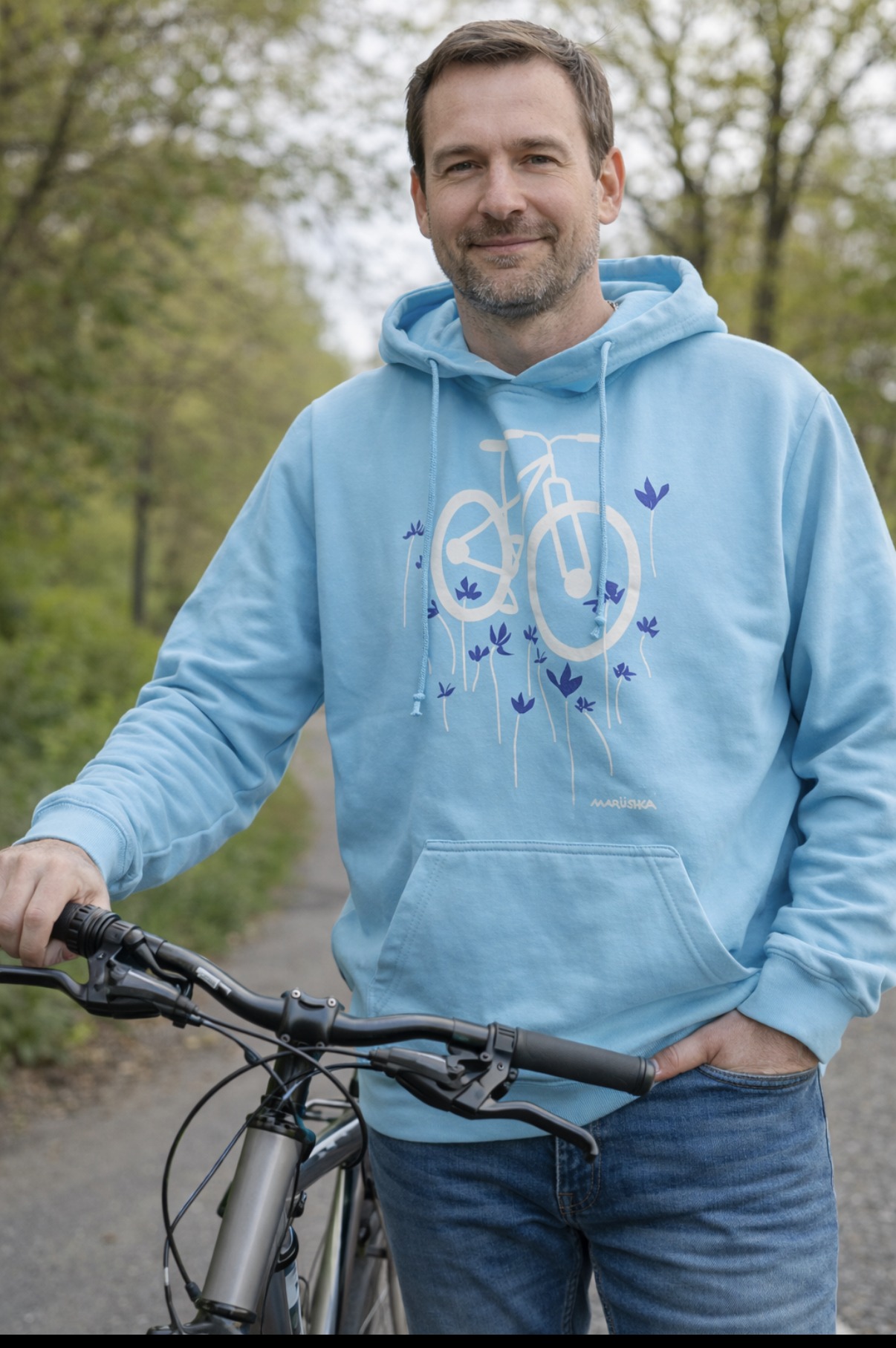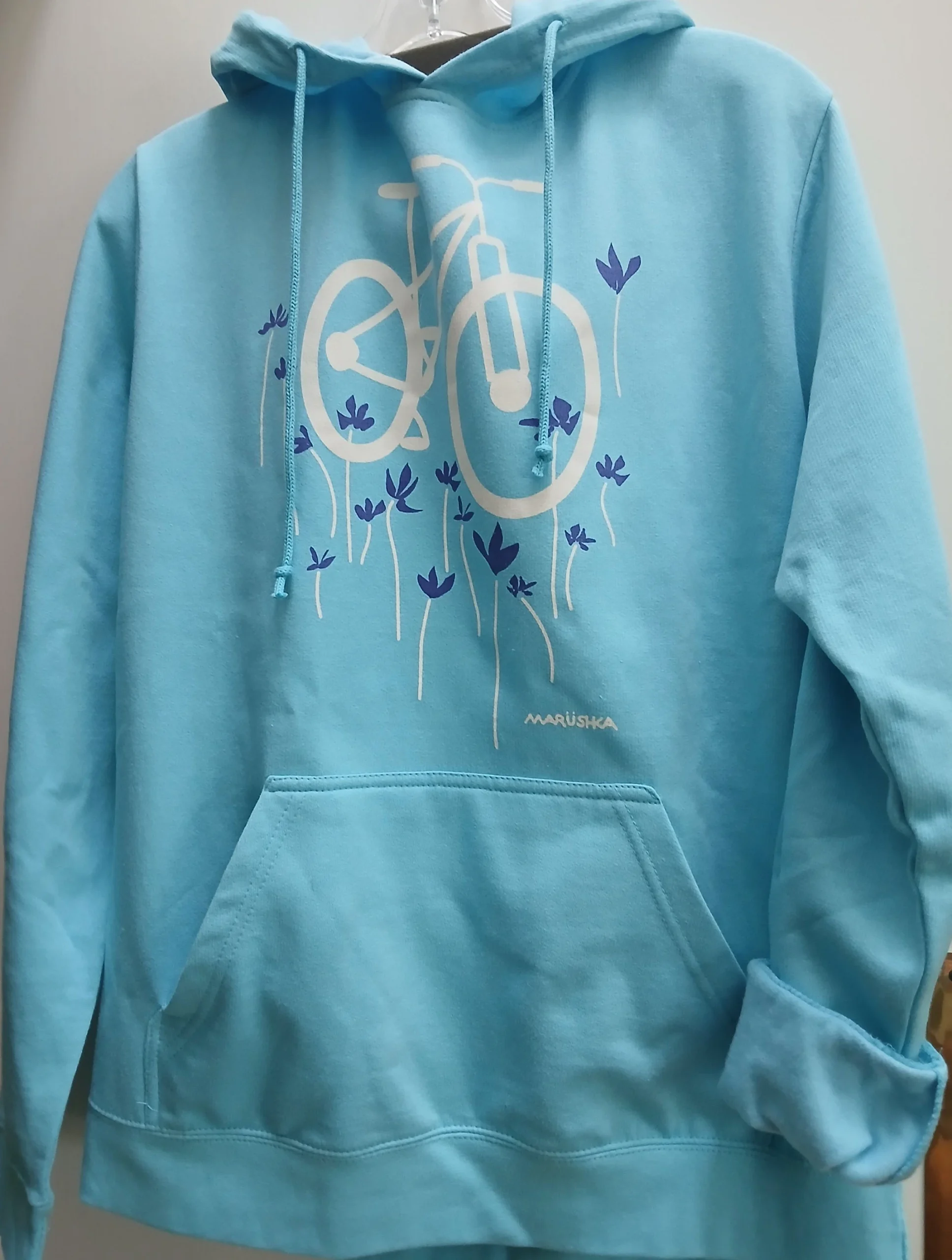 This lightweight fleece hoodie brings together comfort, casual ease, and Marushka’s signature artistry. The soft turquoise background sets the stage for a playful silk-screened design of a bike and flowers, making it a cheerful piece for spring and beyond.
